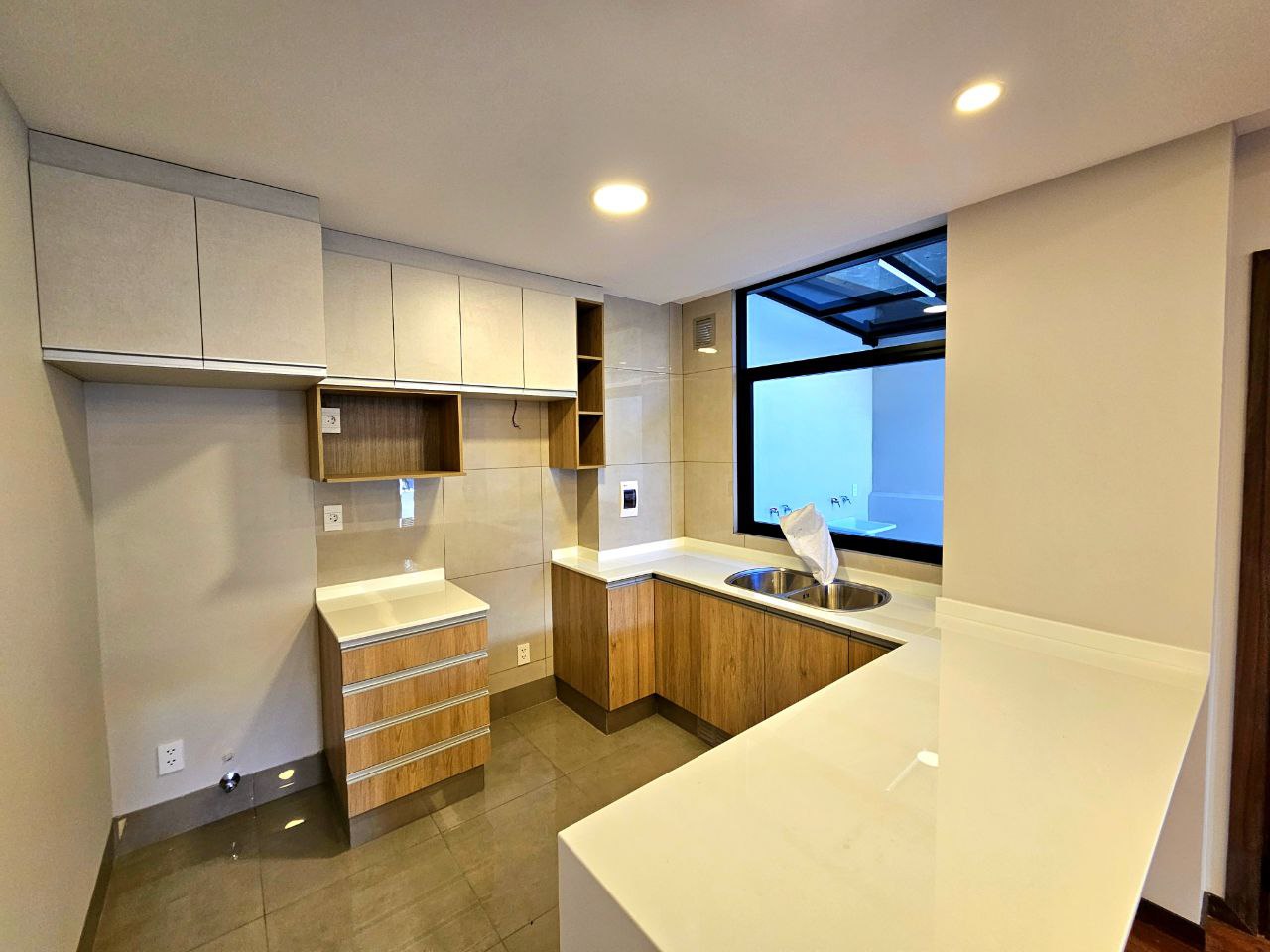 ● Cocina con mesones de mármol y muebles altos/bajos